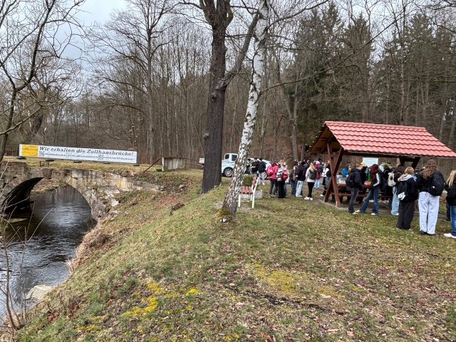 Am letzten Donnerstag hatten wir viel Besuch an der Zollhausbrücke. Drei Klassen vom Geschwister Scholl Gymnasium Nossen haben ihren Wandertag genutzt um durchs Muldental zur Zollhausbrücke Bieberstein zu wandern. Hier gab es eine erste kleine „Stärkung“ und einige Informationen zu der alten Brücke.